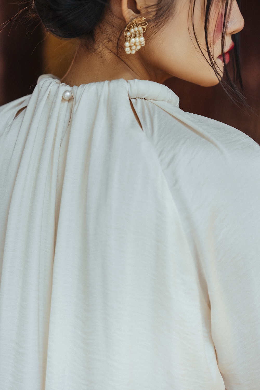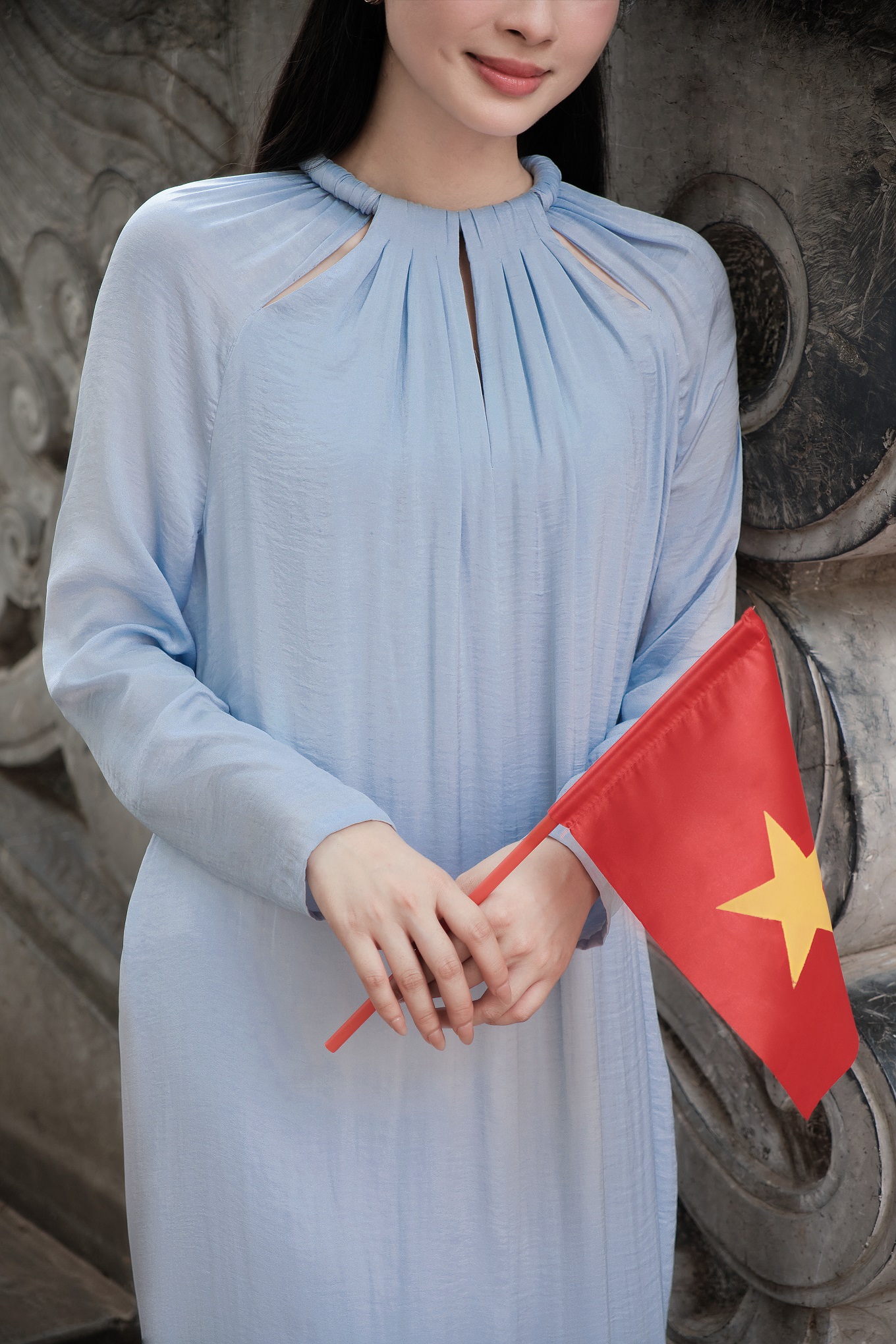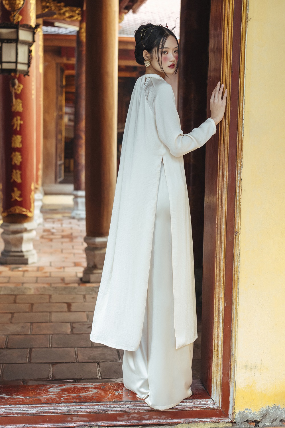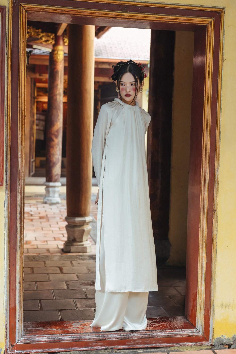 Được phát triển trên phom áo dài raglan dáng suông không chít eo truyền thống, điểm nhấn nổi bật nhất của áo dài Băng Ngọc chính là phần cổ lấy cảm hứng từ mấn đội đầu của phụ nữ Việt xưa. Với kỹ thuật và sự quan sát tinh tế, đội ngũ thiết kế December Chris dành nhiều ngày để hoàn thiện chi tiết cổ cũng là key detail của áo dài Băng Ngọc. Kết quả là một thiết kế áo dài độc đáo, cá tính nhưng không kém phần nữ tính được phát triển trên bản sắc thẩm mỹ giàu đẹp của văn hóa Việt.