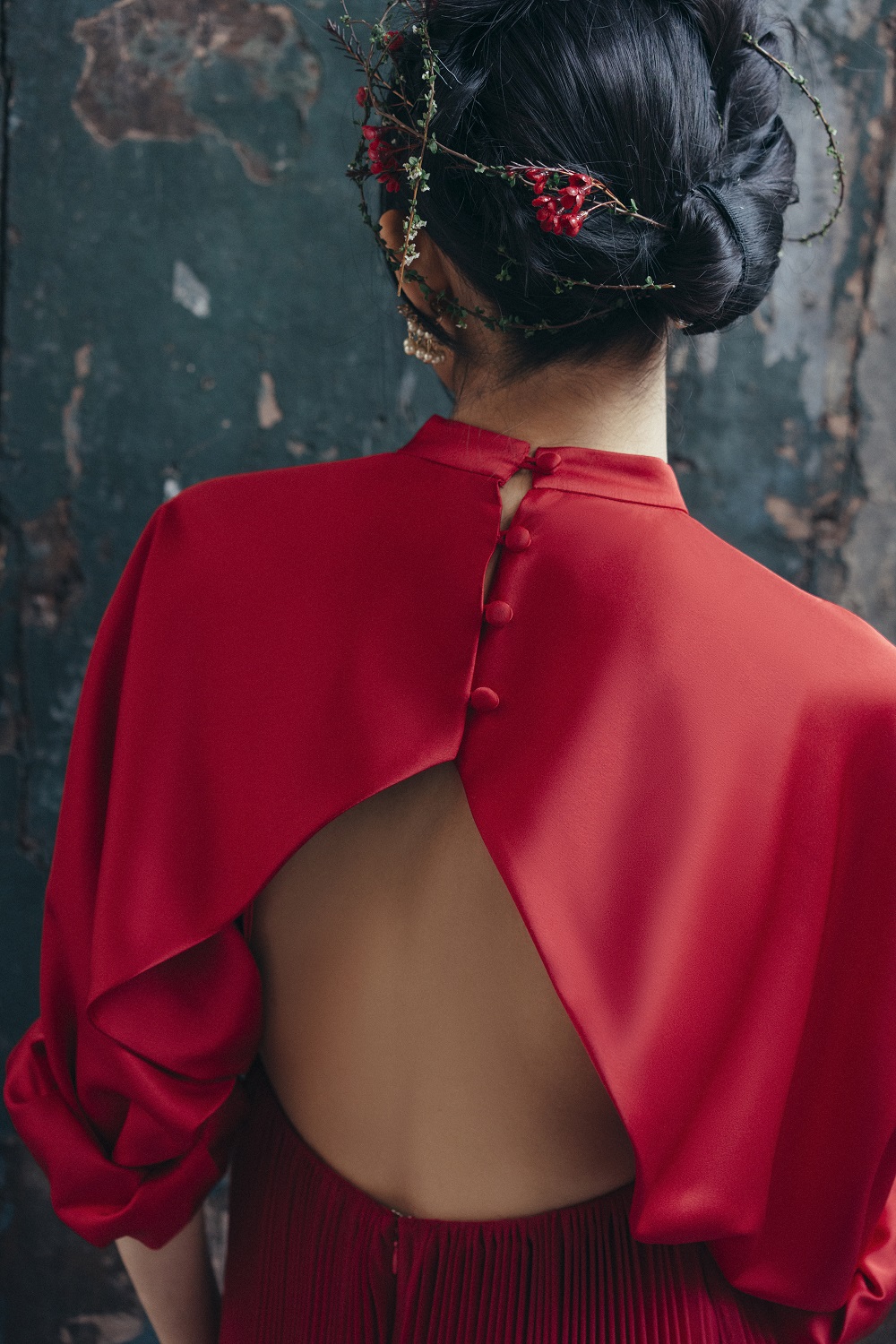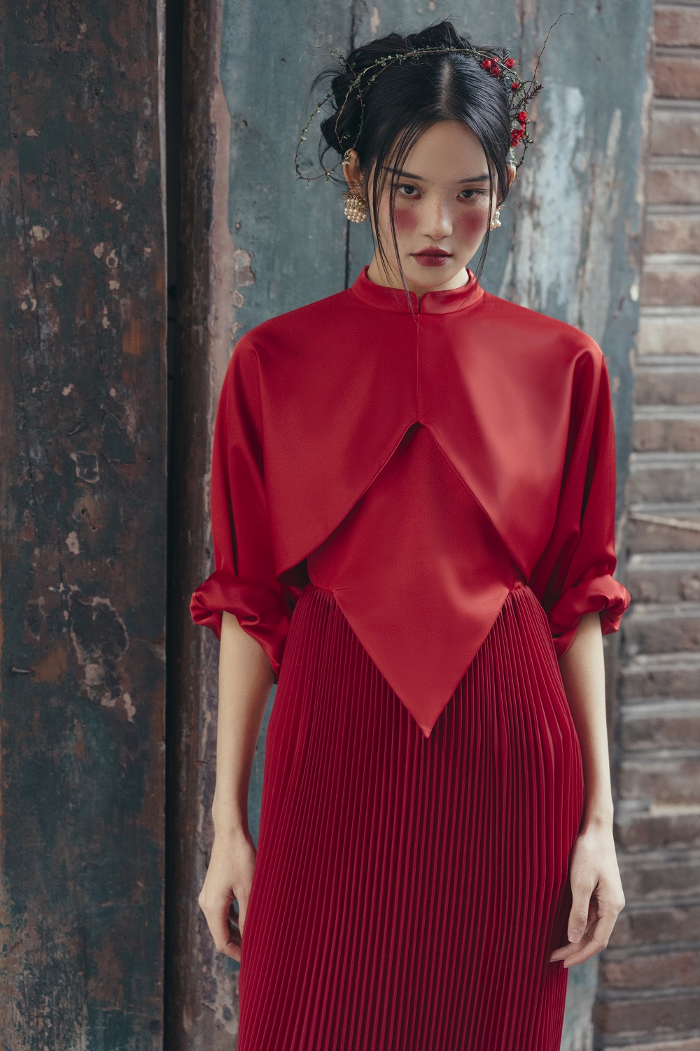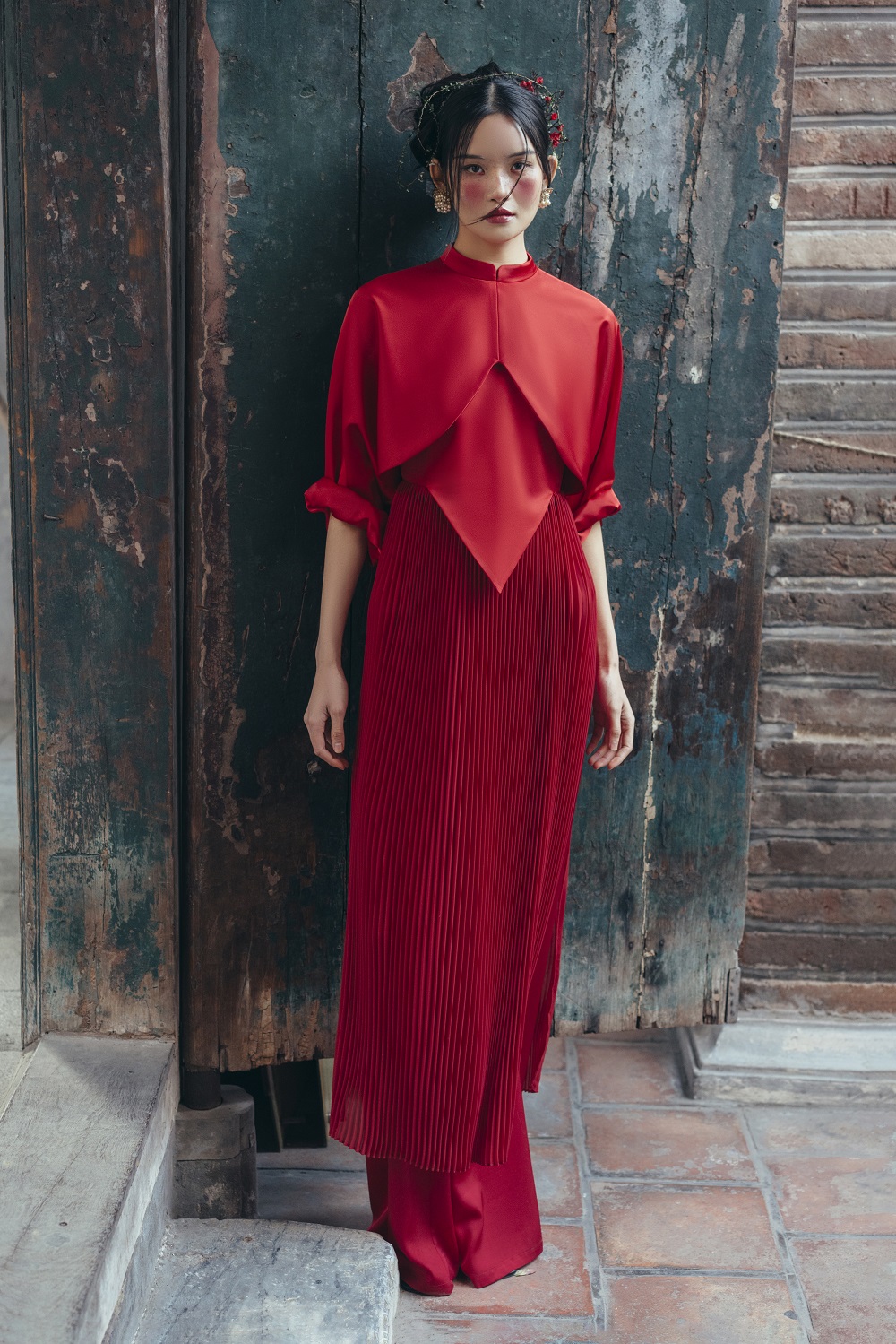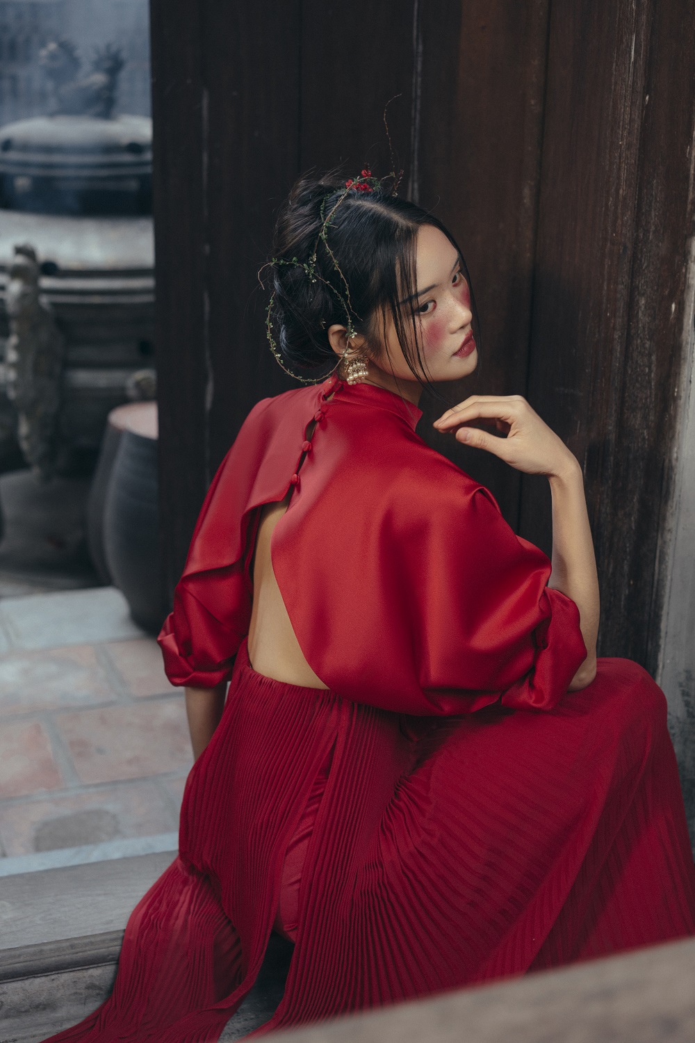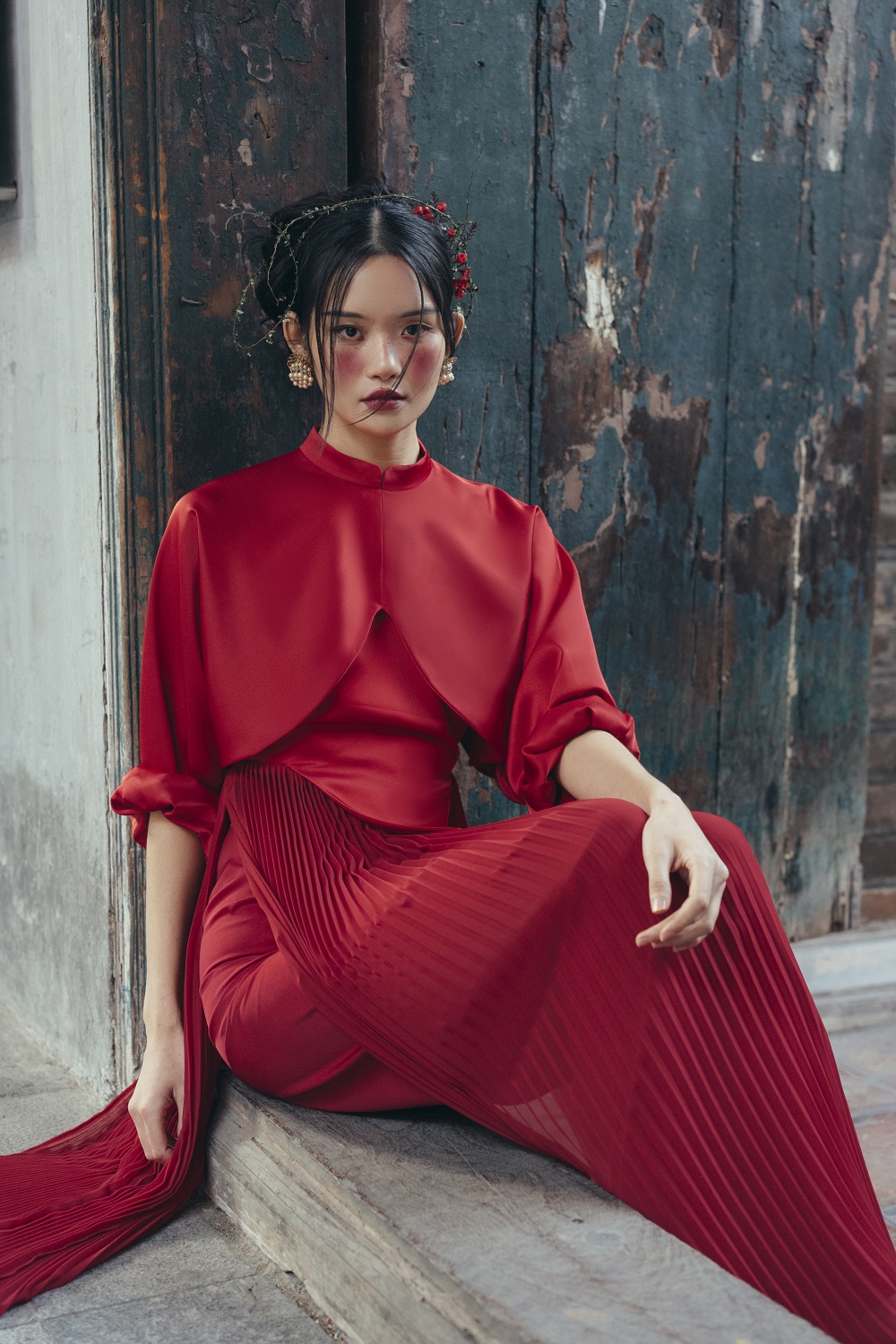 Vượt xa giới hạn của sự sáng tạo, Áo Dài Thuyền Quyên là minh chứng cho sự tìm tòi và ứng dụng chất liệu văn hóa của December Chris. Vạt áo quả trám lấy cảm hứng từ chéo khăn mỏ quạ, thân áo với đường cut-out táo bạo lộ lưng trần quyến rũ, phần thân dưới dập ly đầy tinh tế và hiện đại, phối cùng quần lụa mềm cùng tone. Sắc đỏ rực rỡ và sự quyến rũ của áo dài Thuyền Quyên chắc chắn sẽ chiếm spotlight cho người mặc vào dịp Tết sắp tới.