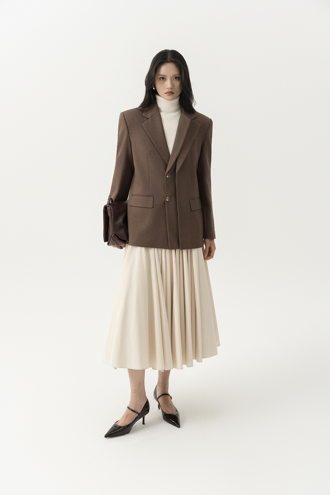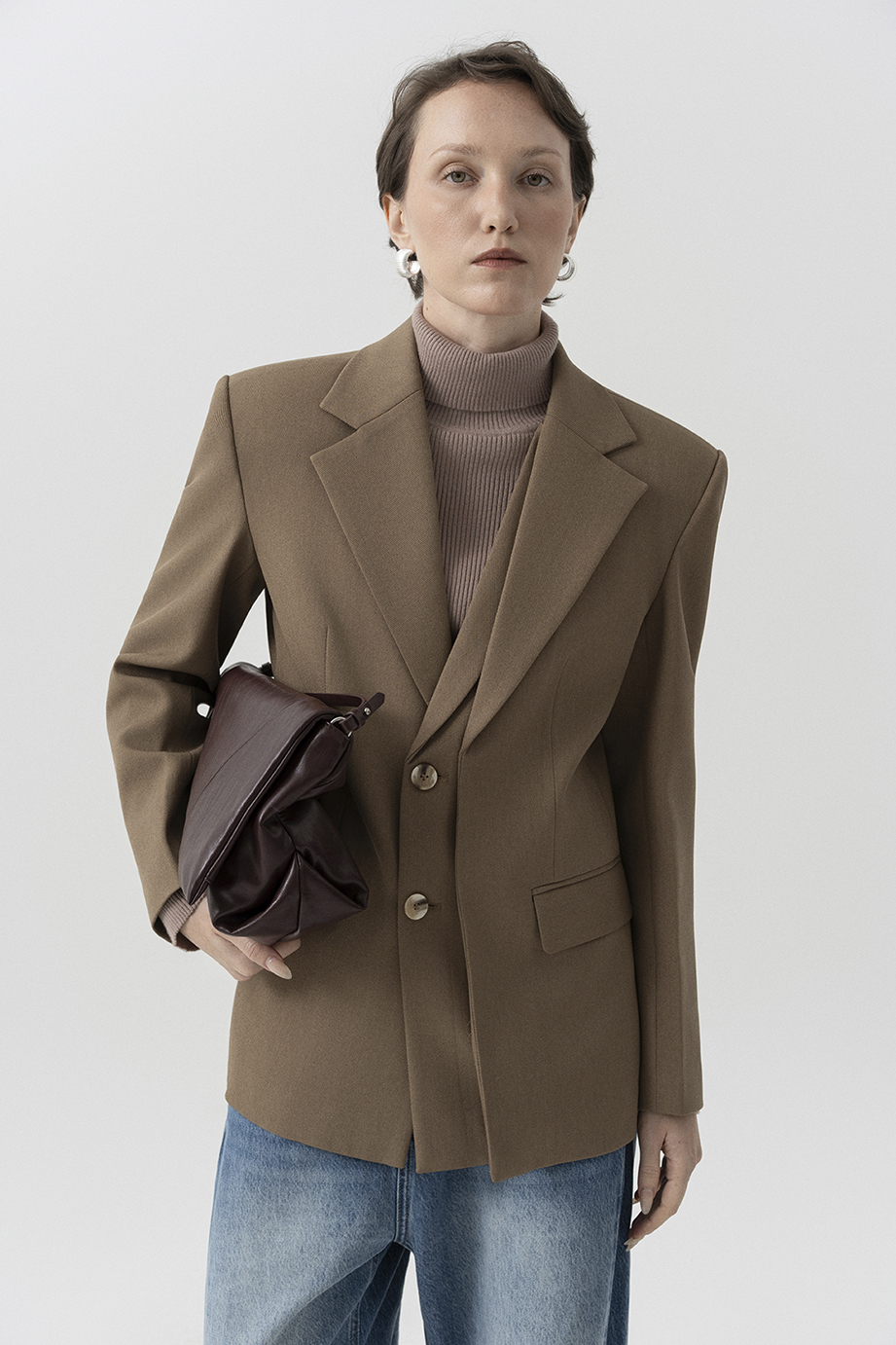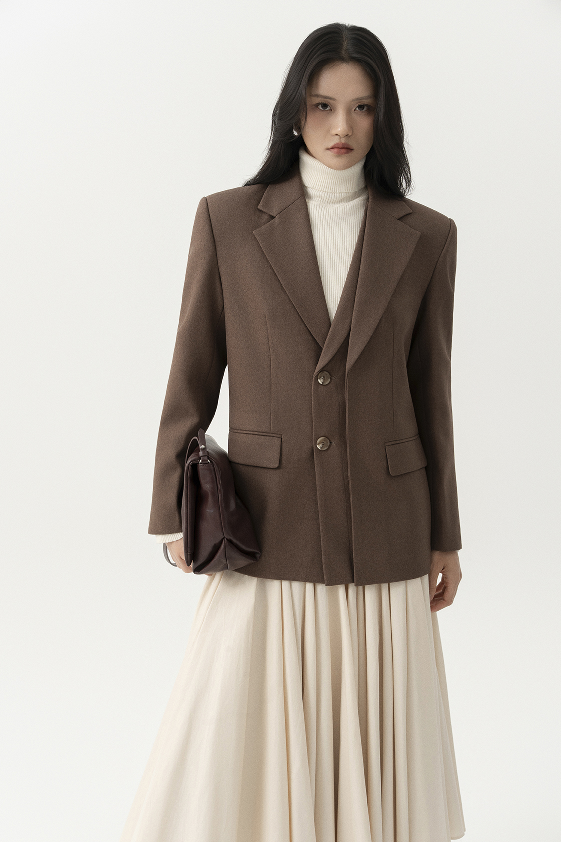 Phom blazer cơ bản hai nắp túi, với điểm nhấn là phần tà đôi bên trái cùng ve cổ đúp bất đối xứng đầy cá tính. Vải dệt thoi 60% cotton, 40% polyester kiểu dệt chéo giữ ấm, lót lót 70% cotton 30% lụa tằm kiểu dệt lụa thoải mái.