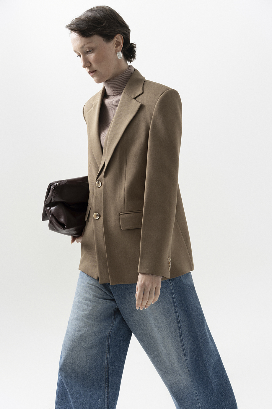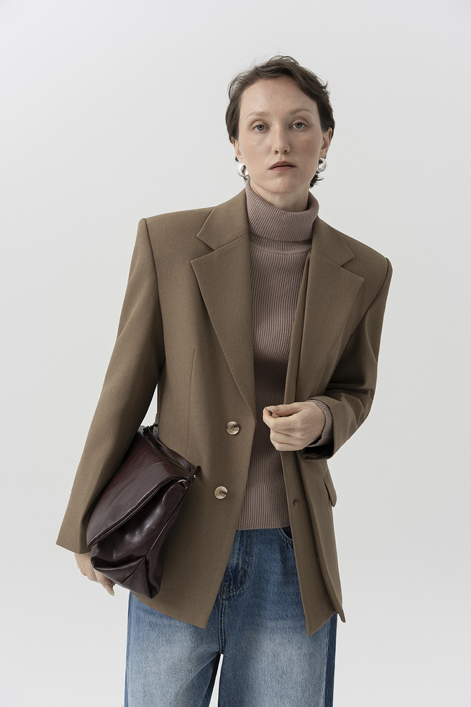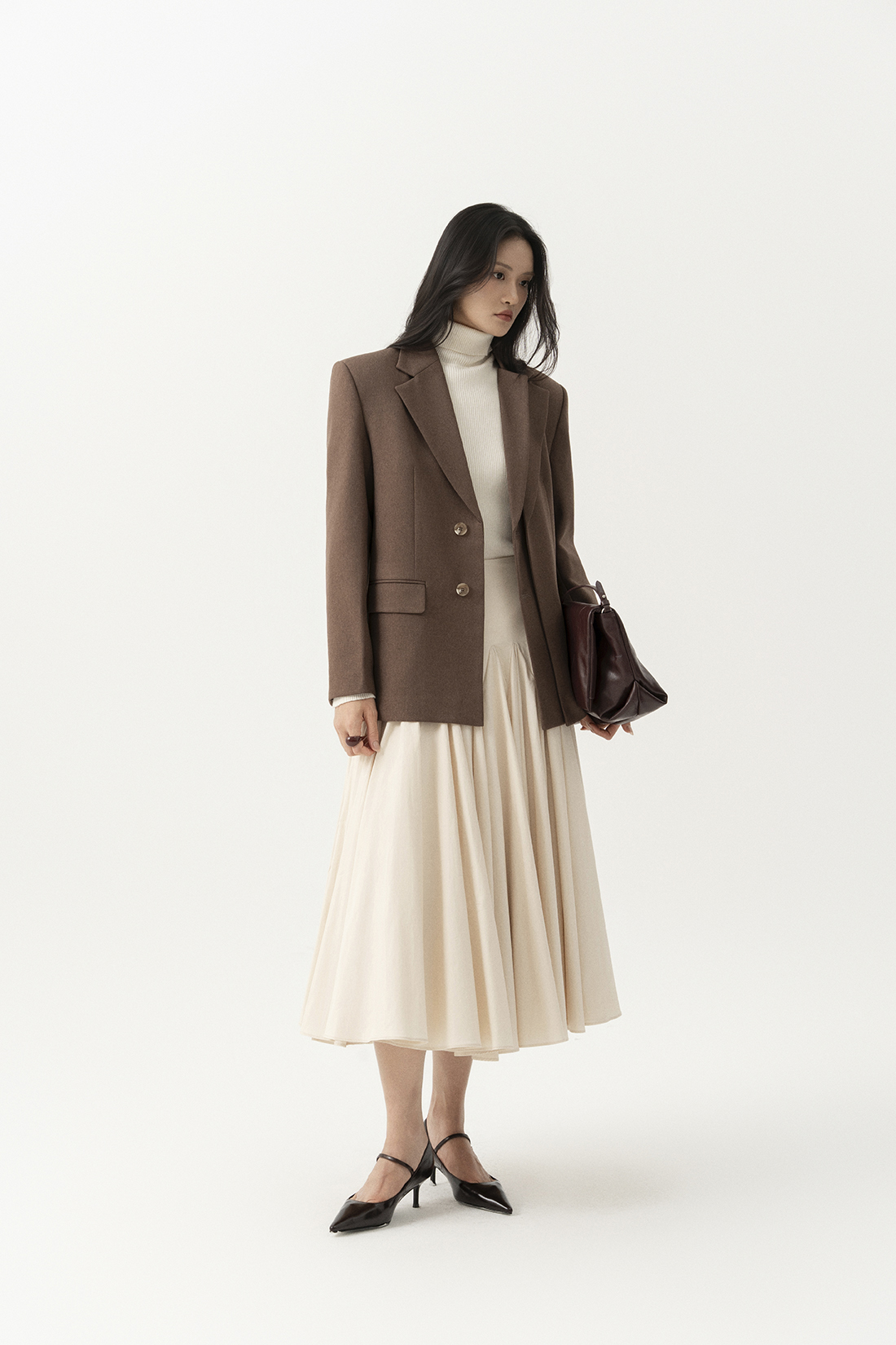 Phom blazer cơ bản hai nắp túi, với điểm nhấn là phần tà đôi bên trái cùng ve cổ đúp bất đối xứng đầy cá tính. Vải dệt thoi 60% cotton, 40% polyester kiểu dệt chéo giữ ấm, lót lót 70% cotton 30% lụa tằm kiểu dệt lụa thoải mái.