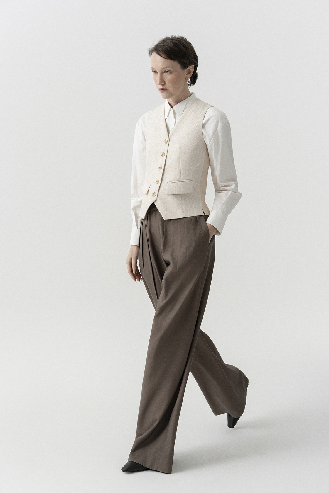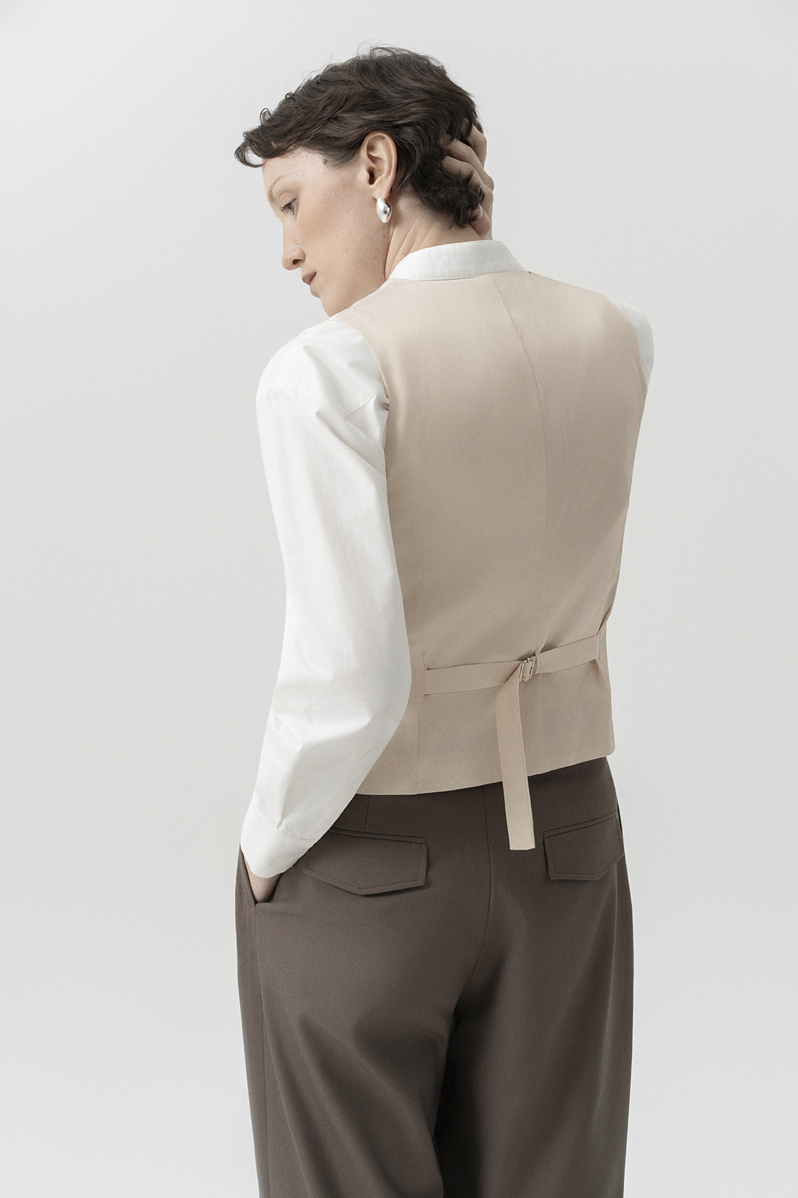 Thiết kế ôm vừa vặn cơ thể, đường chiết tỉ mỉ giúp tôn dáng và tạo hiệu ứng eo gọn, đằng sau lưng áo làm bằng mềm, thích hợp mặc riêng hoặc phối cùng áo sơ mi, áo khoác cộc tay hoặc blazer. Vải cotton dệt chéo giúp bề mặt vải có vân tinh tế, đứng dáng, ít nhăn và bền màu. Chất vải dày vừa phải, giữ form tốt, tạo độ sang trọng.