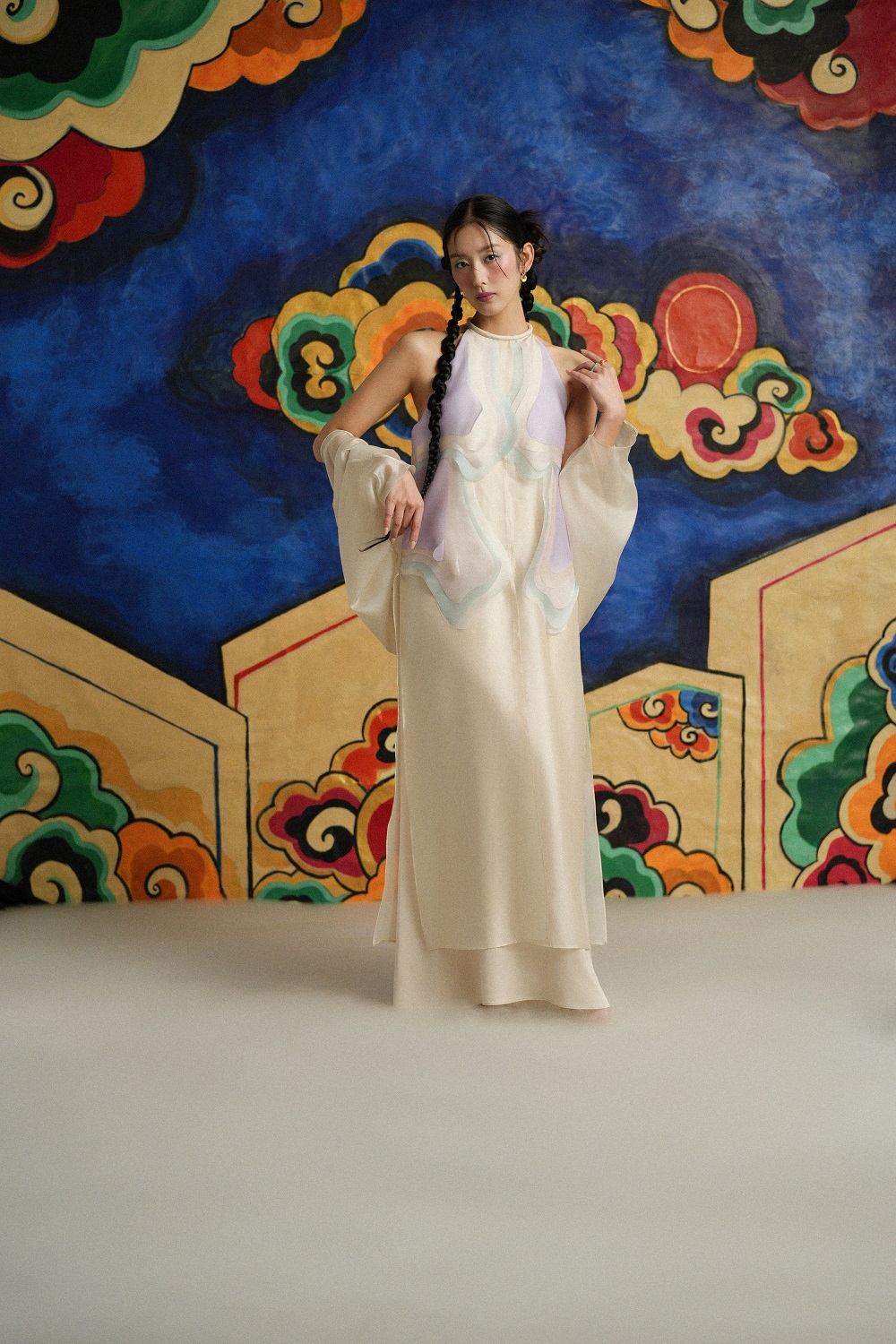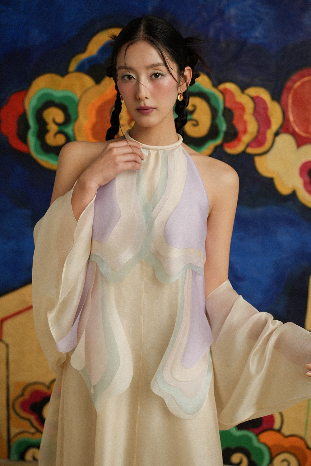 Điểm giao hòa giữa truyền thống và hiện đại hội tụ nơi Đ𝗮̂̀𝗺 𝘆𝗲̂́𝗺 𝗧𝘂̛𝗼̛̀𝗻𝗴 𝗩𝗮̂𝗻. Phát triển trên phom yếm truyền thống, sự sáng tạo nằm ở từng đường nét và chi tiết trên Đ𝗮̂̀𝗺 𝘆𝗲̂́𝗺 𝗧𝘂̛𝗼̛̀𝗻𝗴 𝗩𝗮̂𝗻. Phom suông xòe nhẹ tạo sự uyển chuyển đầy trẻ trung và nữ tính. Chi tiết đắt giá nhất là những layer được cắt laser sáng tạo và chính xách, chất liệu tơ sợi tre nhiều màu sắc tone pastel - xếp lớp lên nhau tạo hiệu ứng óng ả như mây ngũ sắc, tỏa sáng theo từng chuyển động cơ thể.