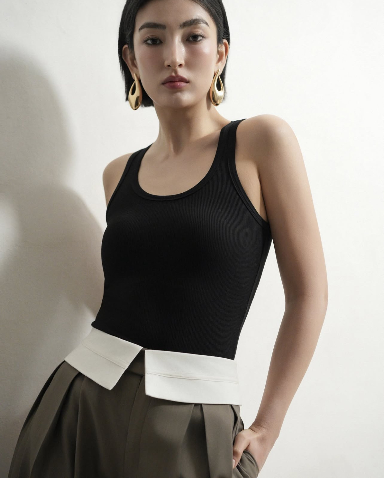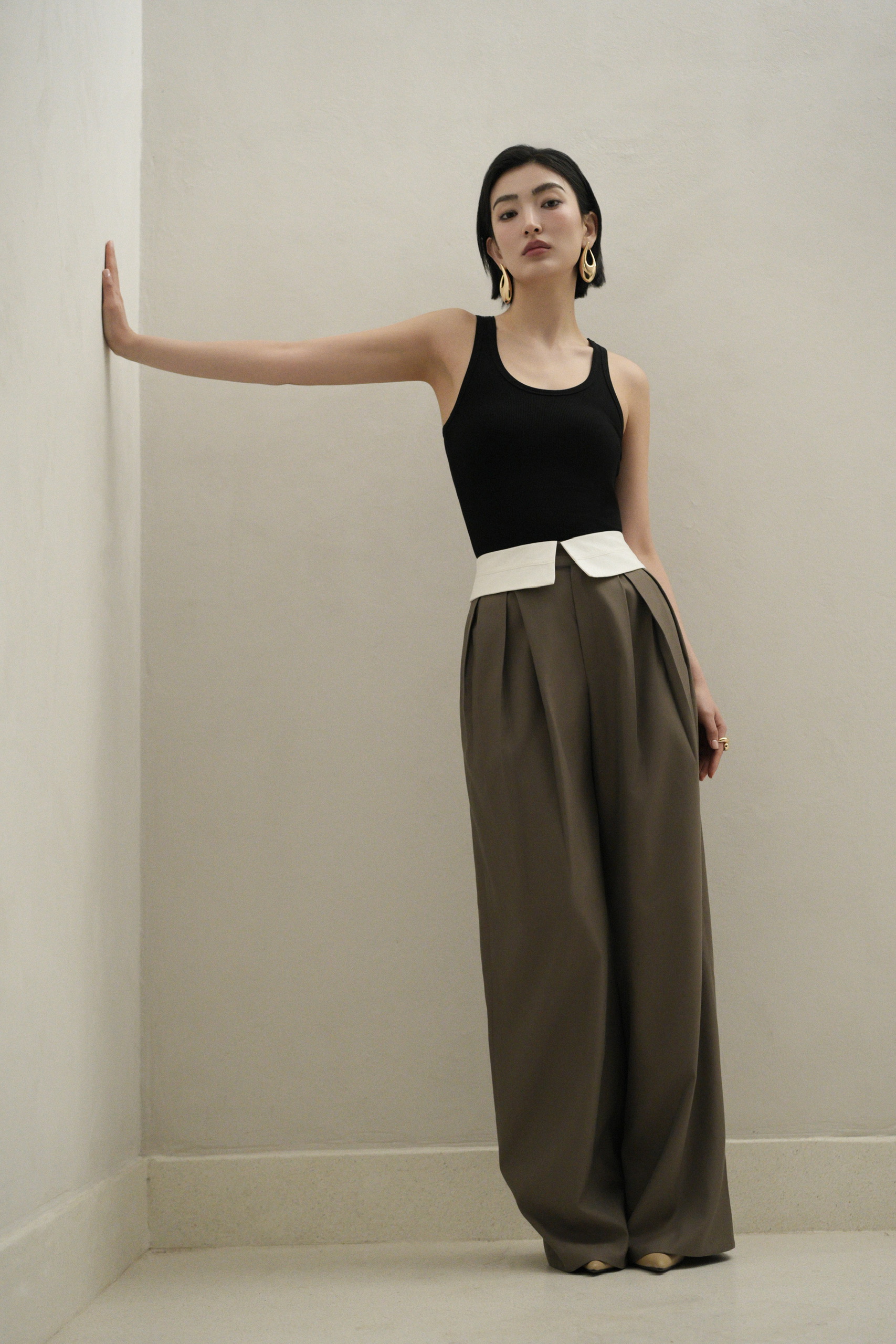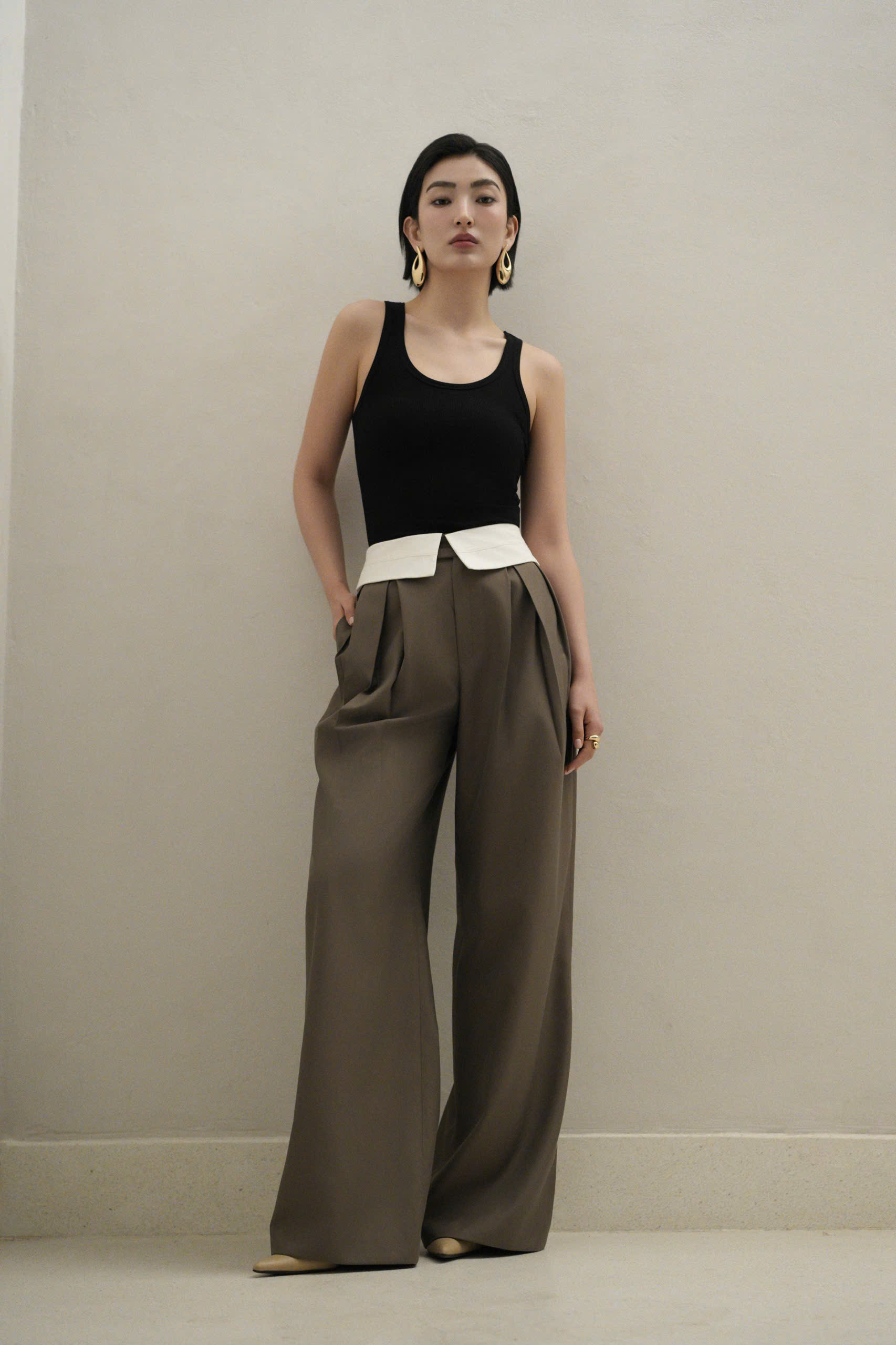 Double Waistband Pants – mẫu quần suông phom rộng, là sự kết hợp hài hòa giữa tinh thần thời trang đương đại và tính ứng dụng cao. Thiết kế nổi bật với phần cạp đôi độc đáo, kết hợp chất liệu tuytsi tông màu trầm và bản cạp sáng màu tương phản, tạo nên điểm nhấn phá cách.