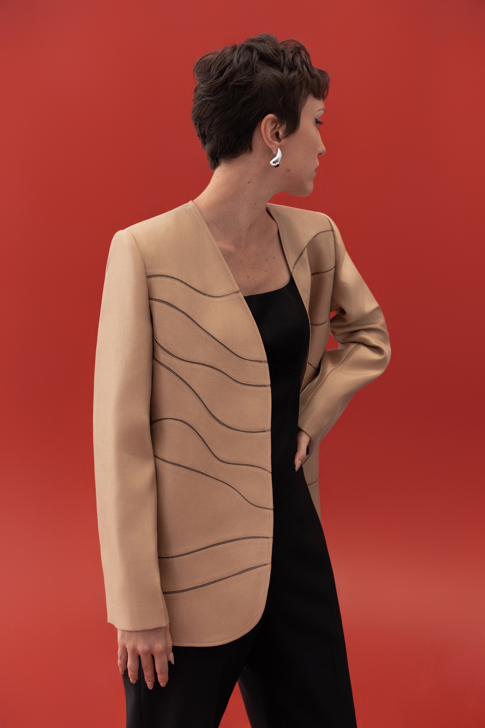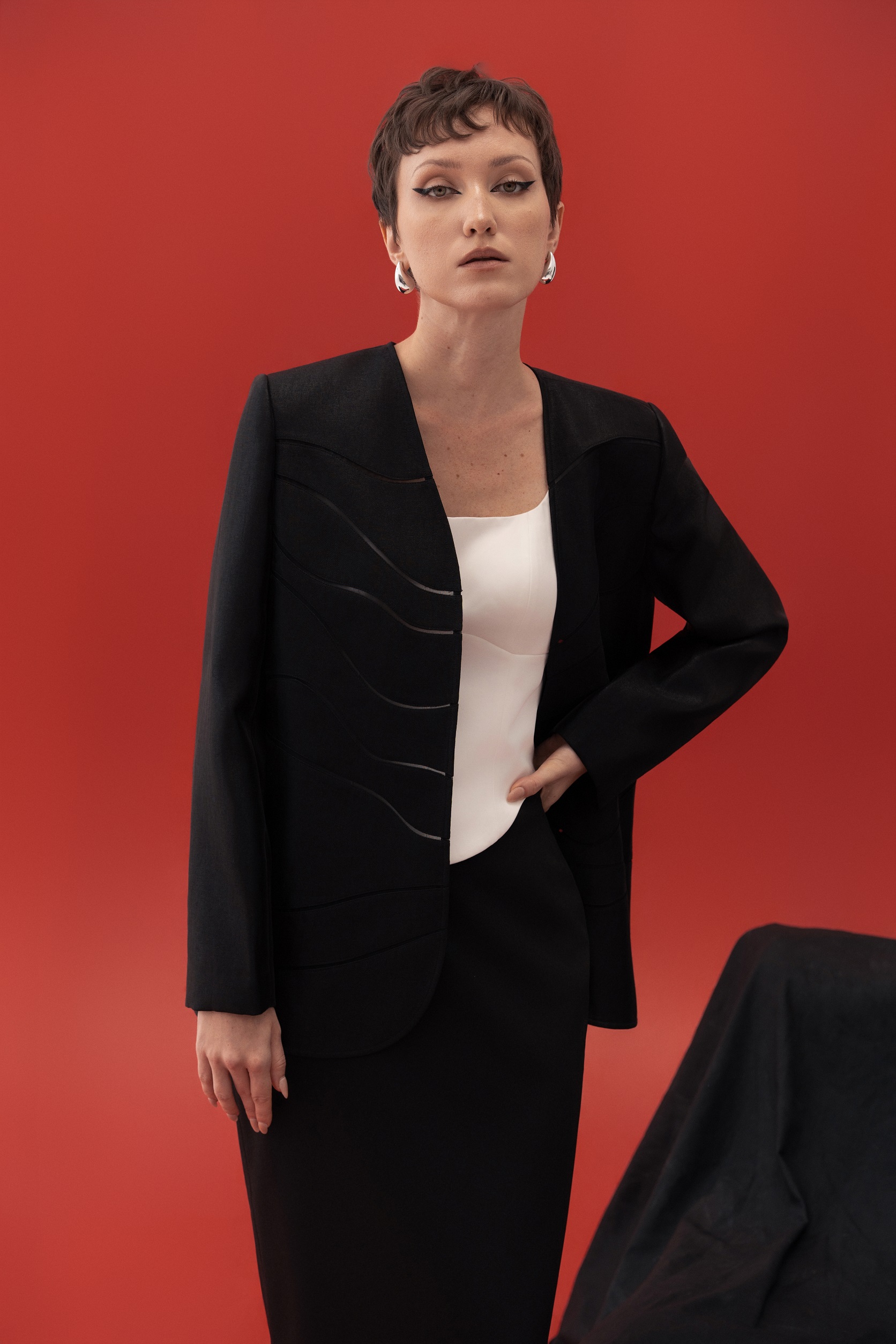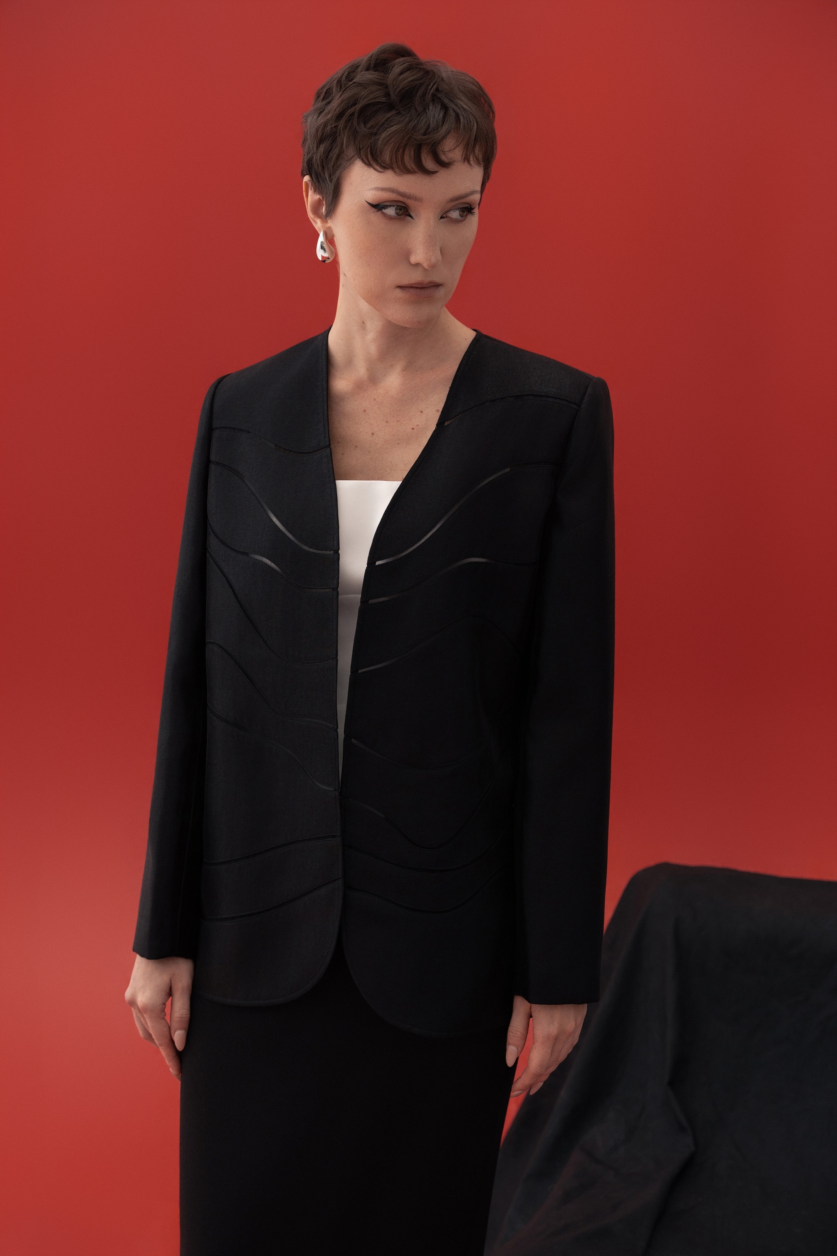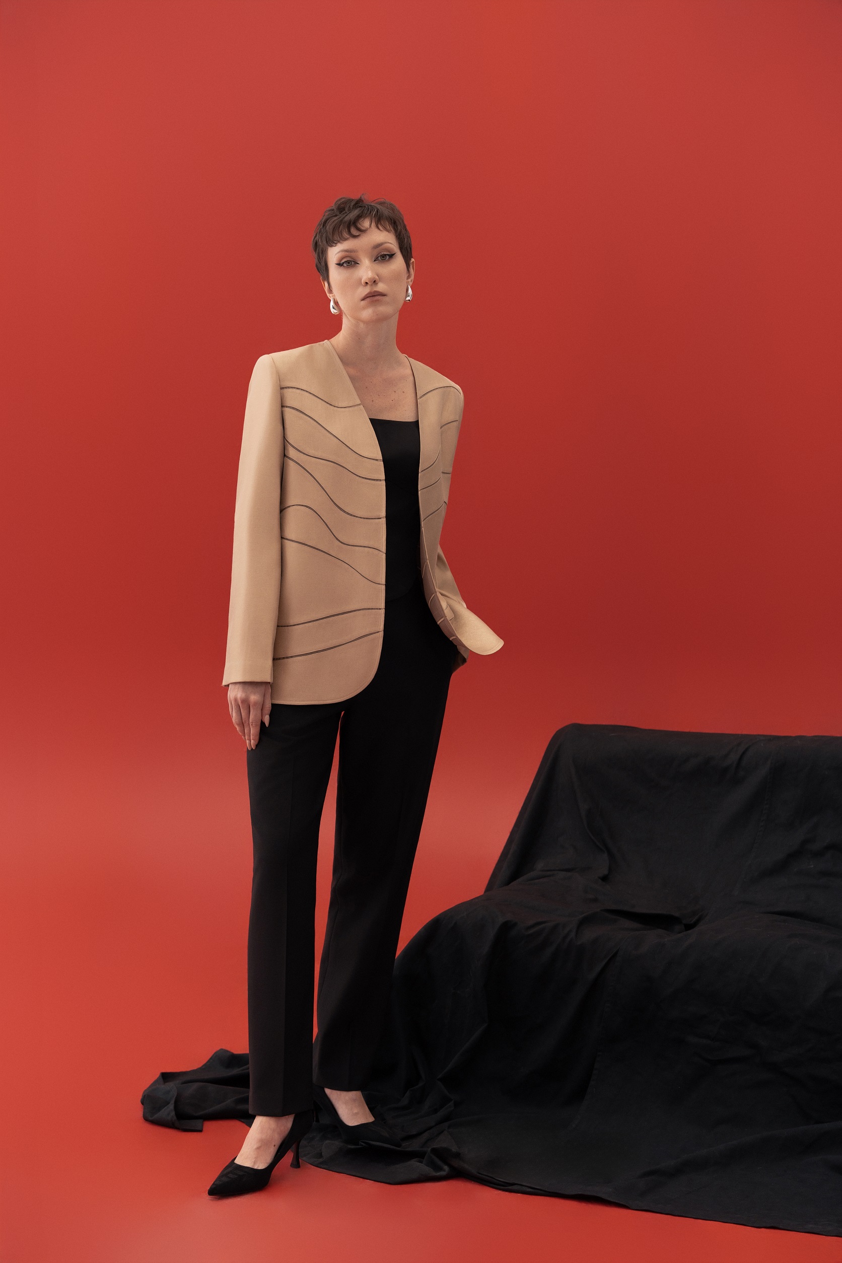 Phác họa pattern ruộng bậc thang từ những đường line chạy dọc blazer không chỉ tạo nên vẻ đẹp hiện đại mà còn thể hiện sự tỉ mỉ và sáng tạo trong thiết kế. Đây chính là lựa chọn hoàn hảo cho những cô gái yêu thích sự thanh lịch, thời trang nhưng không kém phần phá cách.