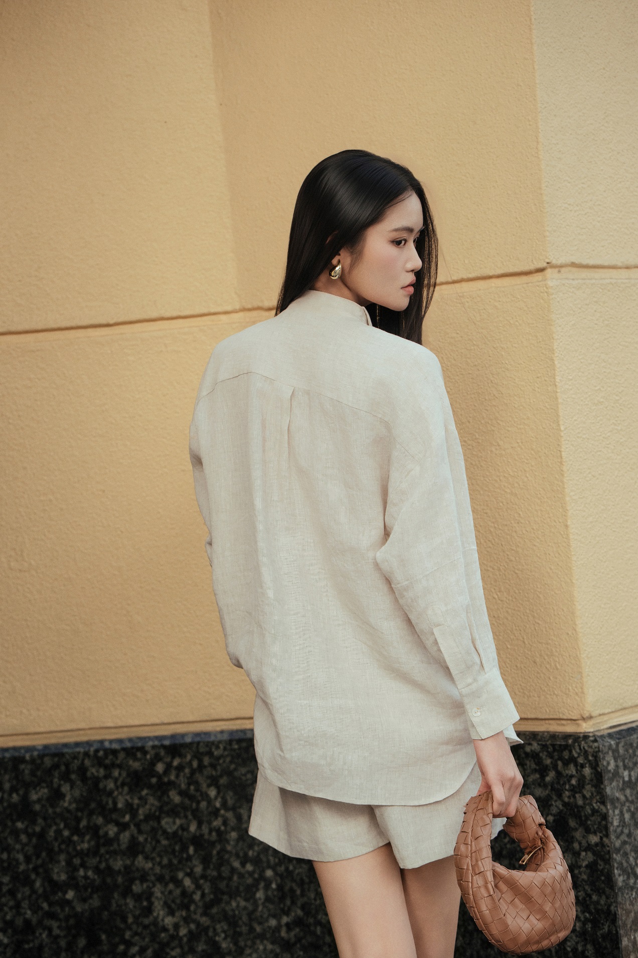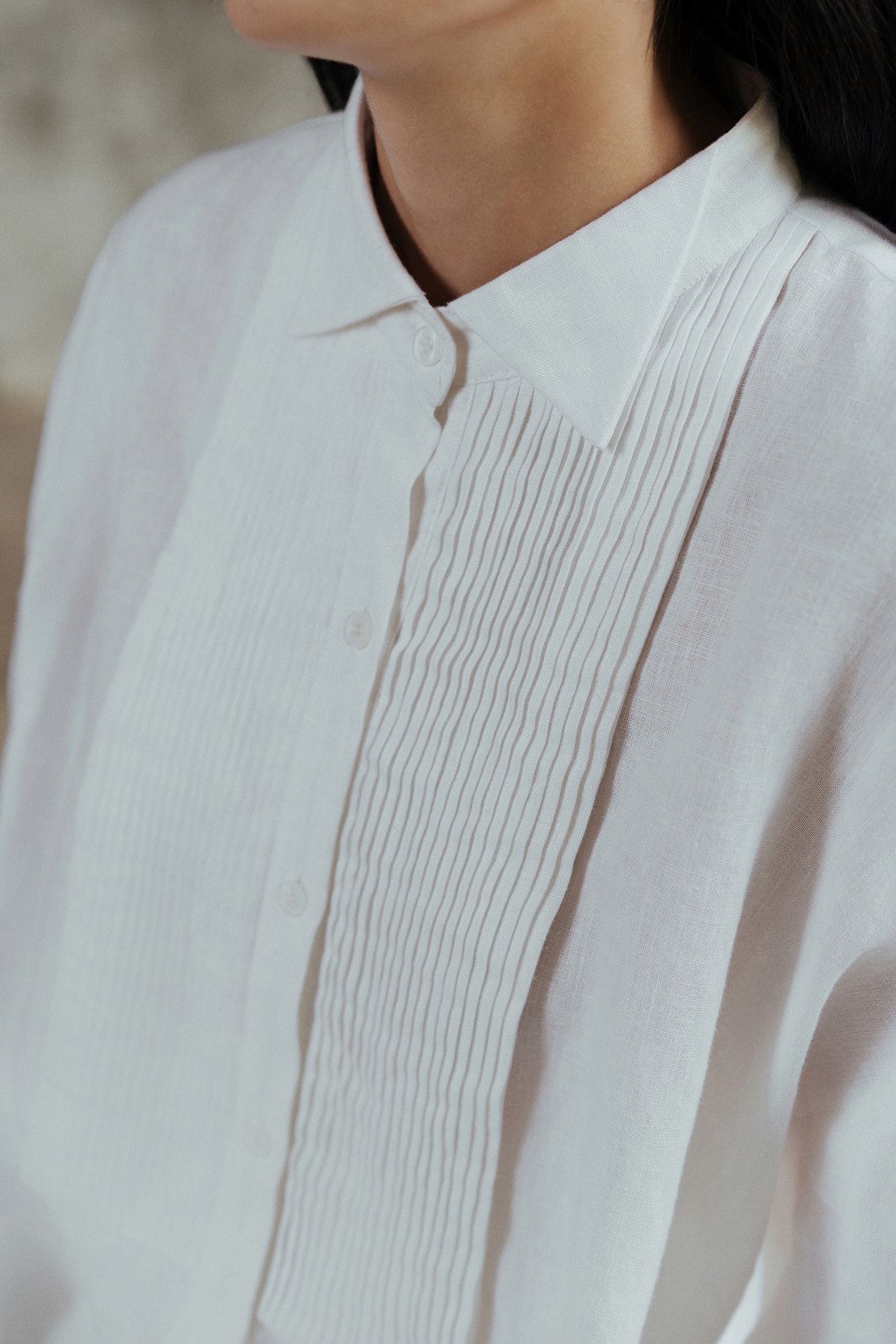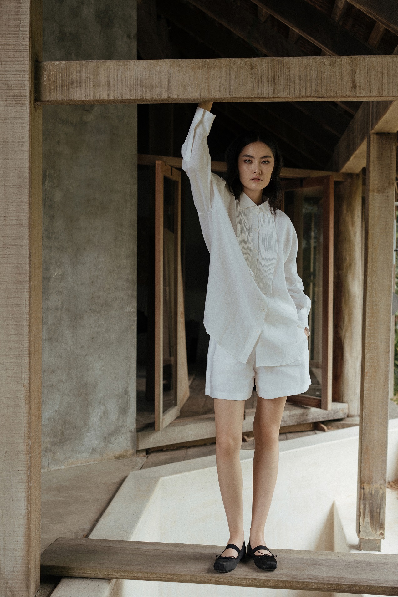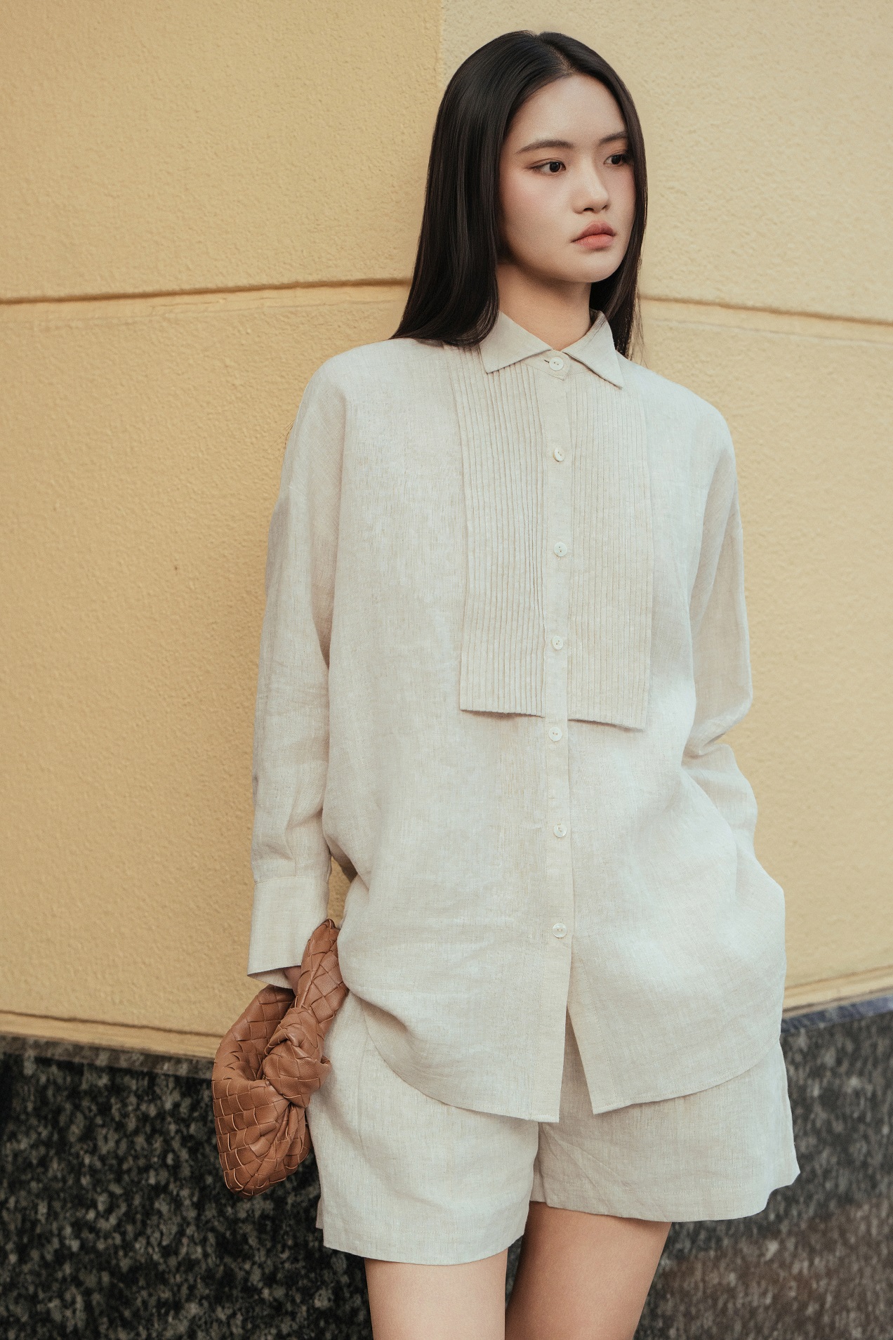 Oversize Pleated Linen Shirt vẫn mang trọn vẹn âm hưởng của Âu phục Cổ điển, với điểm nhấn nằm ở phần cổ bẻ nhọn cùng phần yếm xếp ly kéo dài hơn so với phiên bản cũ, tạo sự thu hút cho người mặc. Chất liệu Linen nguyên chất cùng phom dáng oversize quen thuộc chắc chắn sẽ mang đến trải nghiệm thoải mái, dễ chịu trong những ngày hè oi ả.