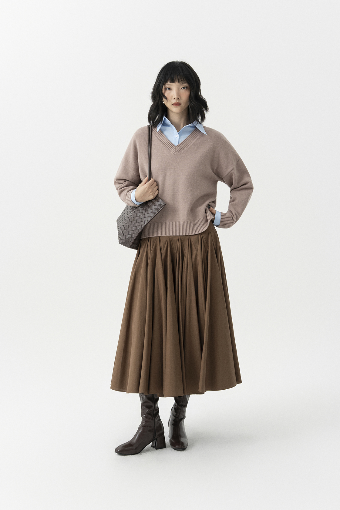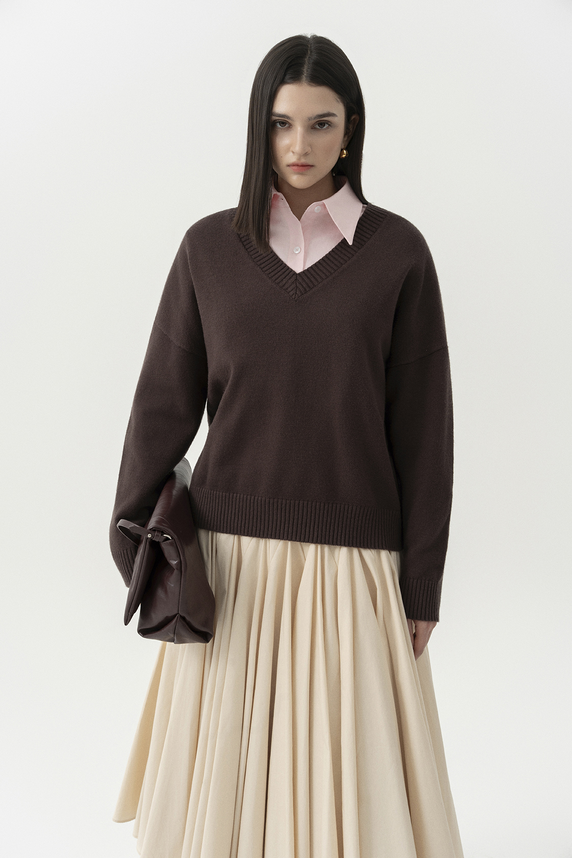 Thiết kế dáng rộng vừa với cơ thể, cổ V dễ phối. Kết cấu dệt kim giúp vải có độ đàn hồi cao, rủ mềm và dễ ôm dáng, trong khi sợi len tự nhiên tạo cảm giác ấm, nhẹ và thoải mái khi mặc trong mùa mát hoặc se lạnh. Co giãn tự nhiên, giúp dễ vận động và tạo sự thoải mái. Ít nhăn, dễ gấp gọn và không cứng vải. Bề mặt mịn, có độ xốp nhẹ, tạo hiệu ứng sang trọng và ấm áp.